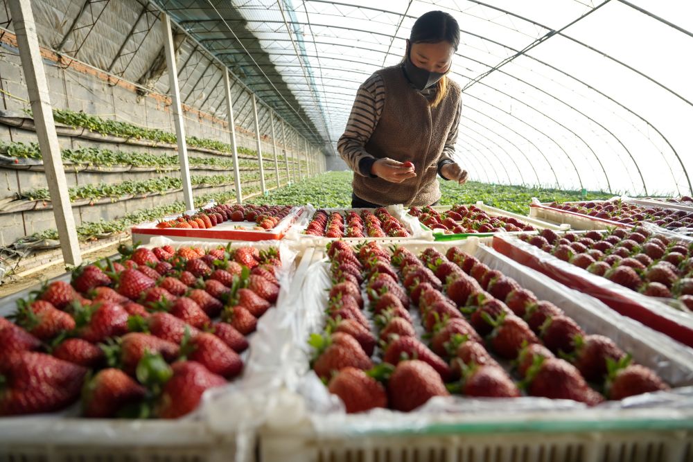 ↑1月15日,农民在河北省滦州市一家现代农业产业园大棚内整理采摘的草莓。