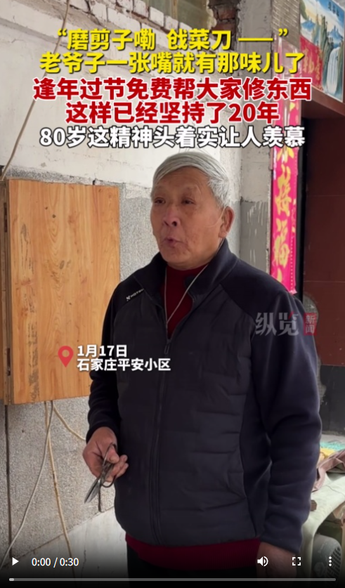 “磨剪子嘞,戗菜刀……”1月17日,石家庄平安小区里照常响起了那句熟悉的吆喝,声音洪亮、中气十足。记者循声见到吆喝人——80岁的郝世龙,他正拿着邻居送来的剪刀,低头打磨。