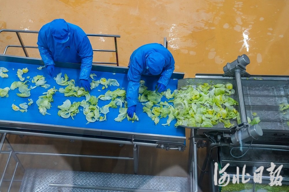 1月9日,定州市鲜洁农业科技有限公司工人在净菜加工车间作业。定州市深入开展“净菜进京”行动。目前,该市有5家企业荣获“河北净菜”品牌使用权、4家蔬菜生产基地被认定为环京周边蔬菜生产基地、1家被认定为河北净菜生产示范基地。河北日报记者许佳奇摄