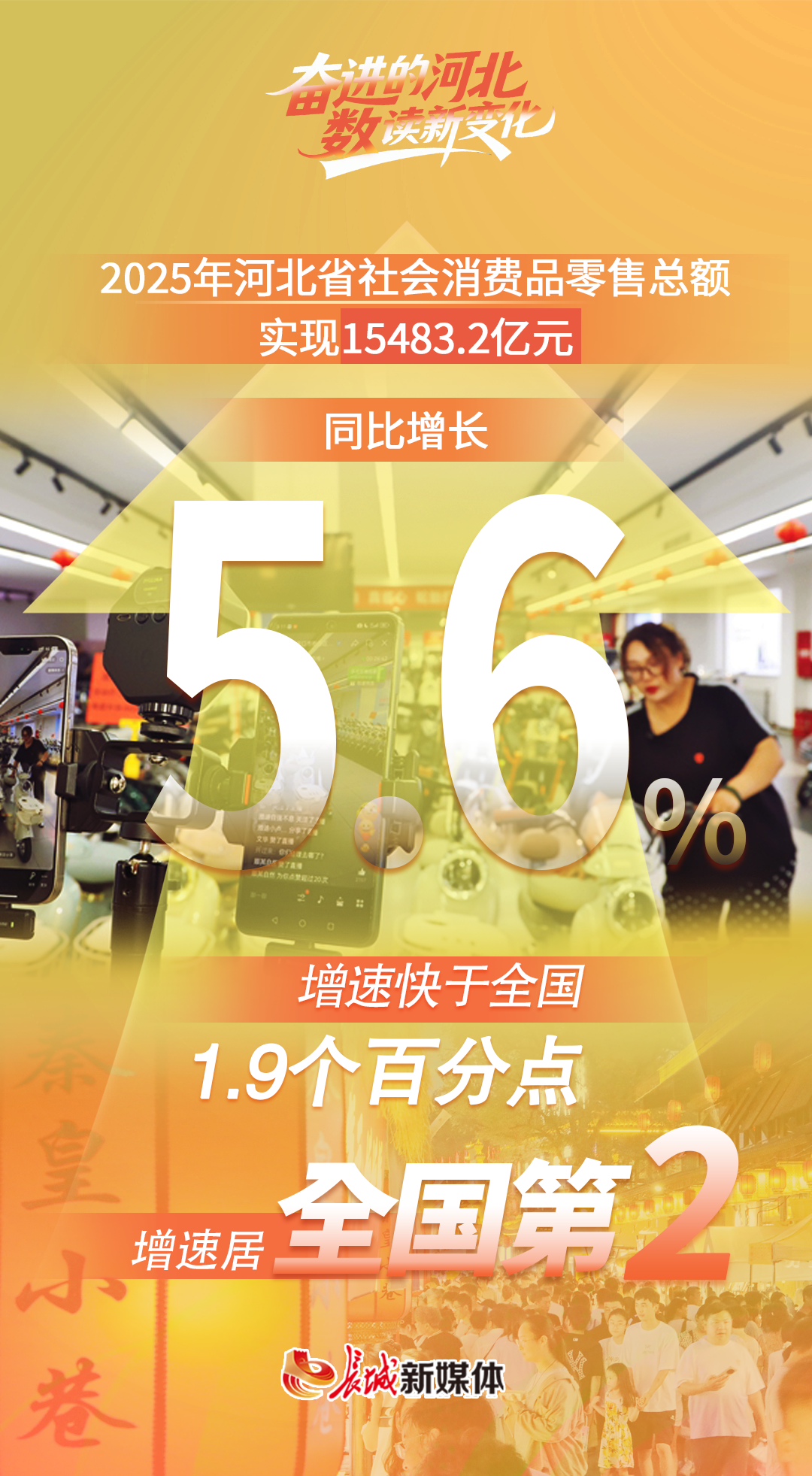 5.6%是2025年河北省社会消费品零售总额(以下简称“社零总额”)的同比增速,这个数字快于全国1.9个百分点,在全国排第2位,反映了河北扩内需、促消费政策落地显效。