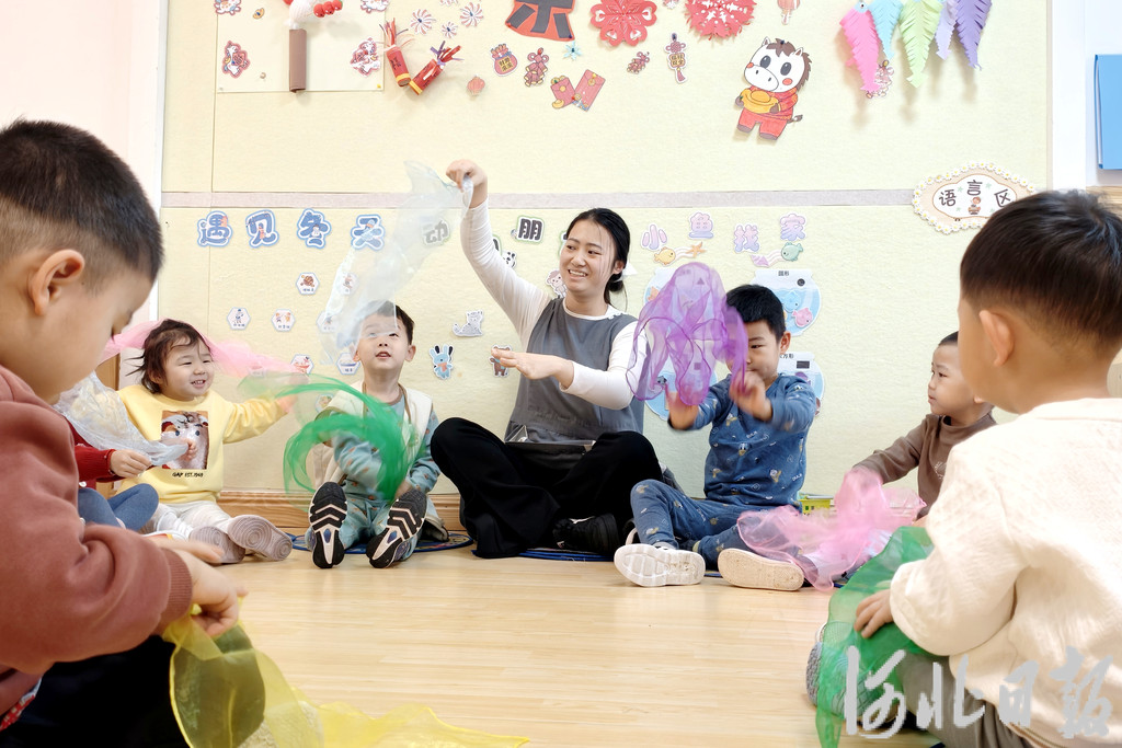 1月13日,在衡水市桃城区小萝卜托育中心,保育老师带着孩子们做游戏。河北日报记者 焦磊摄
