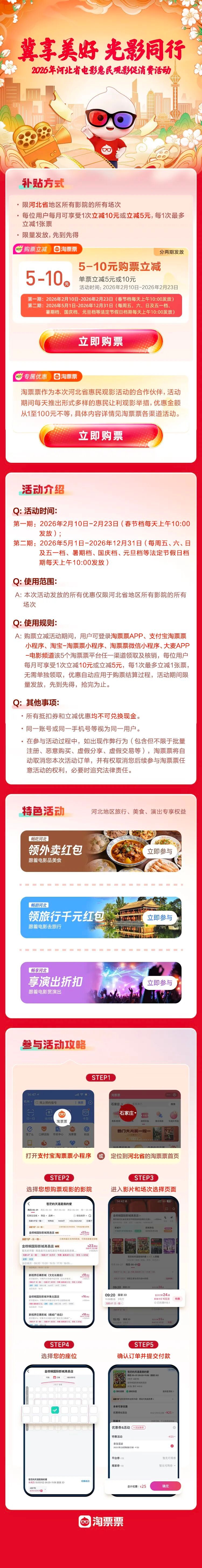 本次活动还将推出“跟着电影赏演出、品美食、去旅行”系列主题活动,将观影体验延伸至演艺、餐饮、旅行等多元生活场景。在“跟着电影赏演出”活动板块,观影用户可通过淘票票、大麦等平台领取演艺优惠券,享受话剧、脱口秀、音乐会等演出项目4-9折优惠;“跟着电影品美食”活动板块,淘宝闪购为购票用户定向推送美食券包,可通过支付宝“淘宝闪购-我的-红包”查看使用;“跟着电影去旅行”联合飞猪旅行发放价值千元券包,进一步拓宽惠民观影服务体系,让电影文化真正融入日常民生。