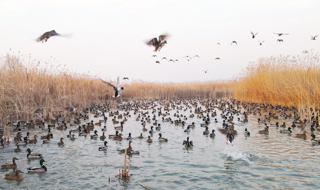 1月31日,白洋淀周边某湿地,成群的野生鸟类在芦苇丛中觅食、栖息。河北日报记者 刘光昱摄