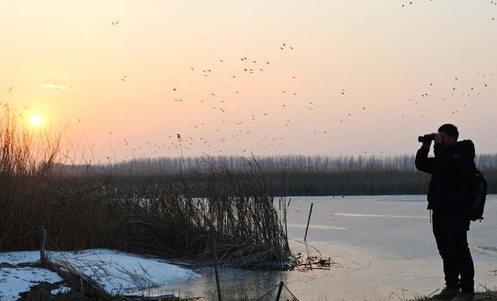 暮色渐浓,夕阳为冰封的淀面镀上一层暖金。归巢的鸟儿掠过水面,留下串串剪影。结束一天巡护的“鸟叔”韩战桥,身影渐渐融入暮色之中。岸边村落里,村民的欢声笑语与淀上的鸟鸣交织相融。这份跨越新春的守护,守护的不仅是鸟类的安宁,更是白洋淀的生态底色,描绘出雄安新区人与自然和谐共生的动人图景。