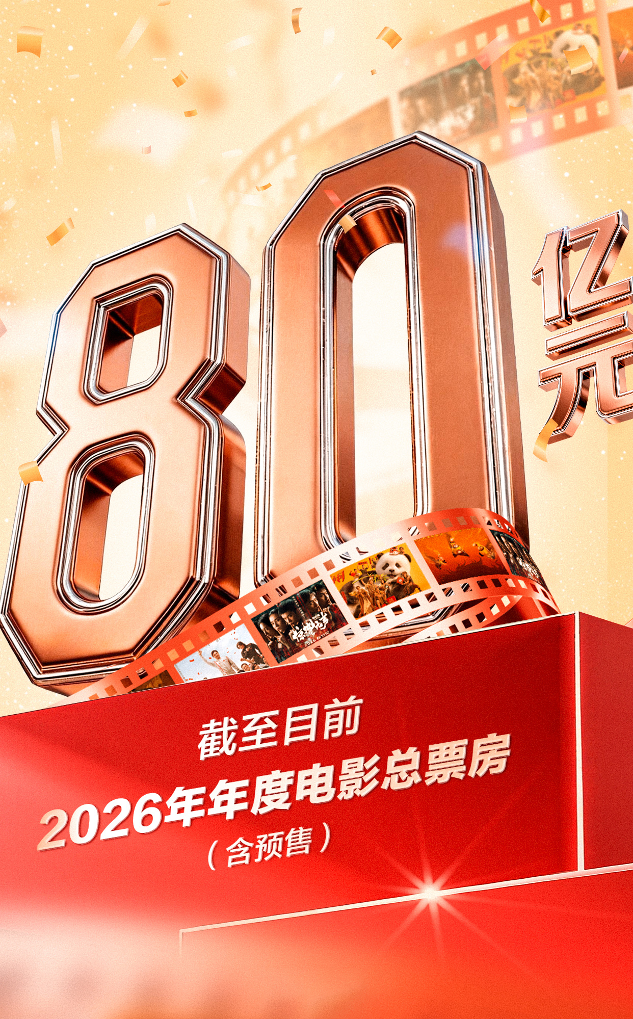据猫眼专业版数据,截至2月23日14时47分,2026年年度总票房(含预售)突破80亿,暂列全球单一市场票房第一!《飞驰人生3》《惊蛰无声》《镖人:风起大漠》暂列年度票房榜前三位。