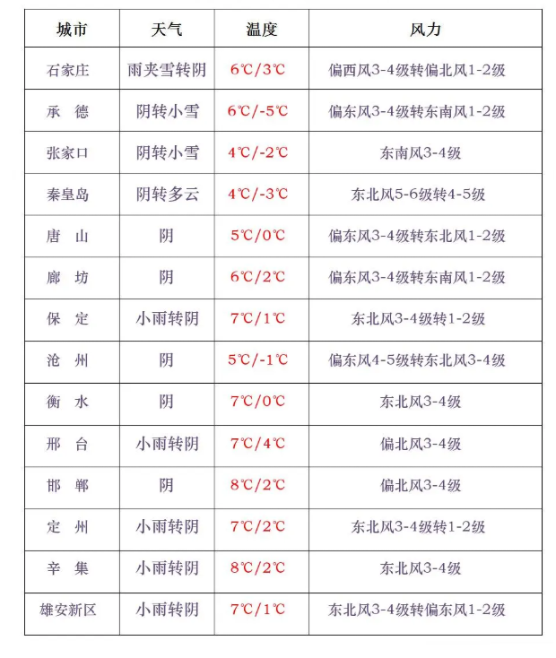 今天白天,张家口、保定阴有小雪,石家庄、沧州西部、衡水西部、邢台西部、邯郸西部阴有小雨或雨夹雪,其他地区多云。今天夜间到明天,张家口、承德、保定西北部阴有小雪转多云,石家庄西部阴有雨夹雪转多云,其他地区多云转晴。