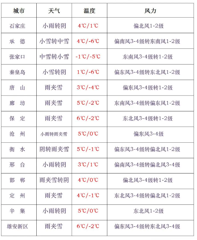 今天白天,全省多云转阴,石家庄、沧州以北地区和邢台西部、邯郸西部有小雪,部分地区有中雪,其他地区有雨夹雪或小雨。