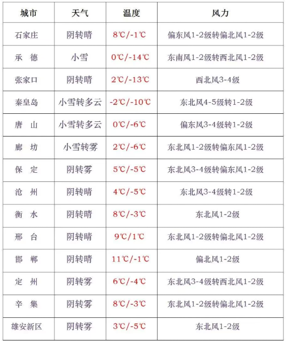 今天白天,保定、廊坊及以北地区阴有小雪,局地有中雪,其他地区阴转多云。今天夜间到6日,承德东部、唐山北部、秦皇岛北部阴有小雪或零星小雪转晴,其他地区晴间多云。