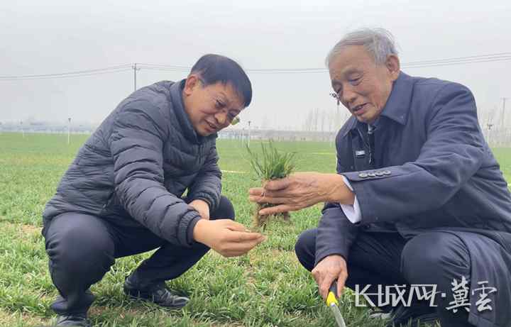郭进考(右)向河北光耀农业服务集团的总经理李光耀讲解春季小麦管理技术要点。长城网·冀云客户端记者 贾宏博 摄