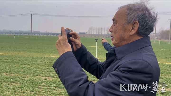 郭进考用手机记录麦田长势情况。长城网·冀云客户端记者 贾宏博 摄