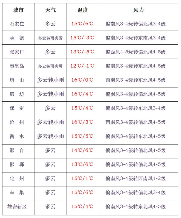 今天白天,全省多云间阴,其中张家口北部、承德北部有零星小雪或雨夹雪,邢台西部、邯郸南部有小雨或零星小雨。