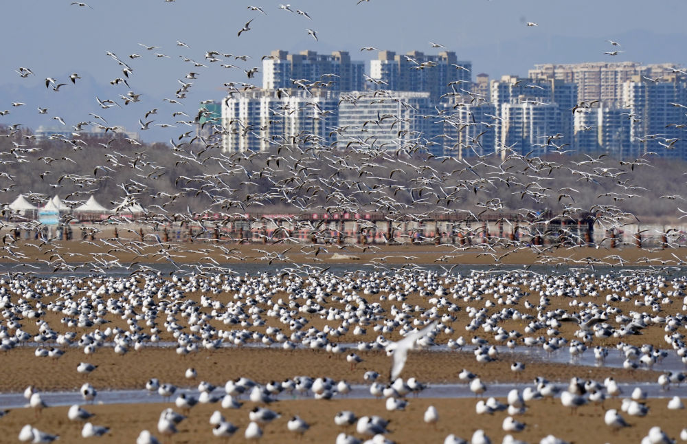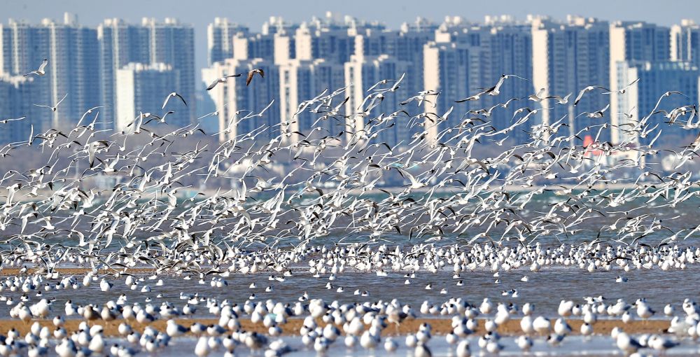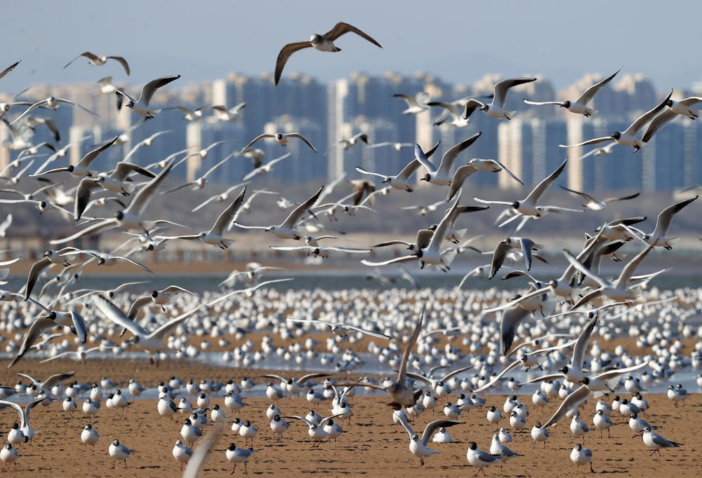 近日,大批海鸥聚集于河北省秦皇岛市北戴河区沿海地区,在蓝天碧海间起舞。