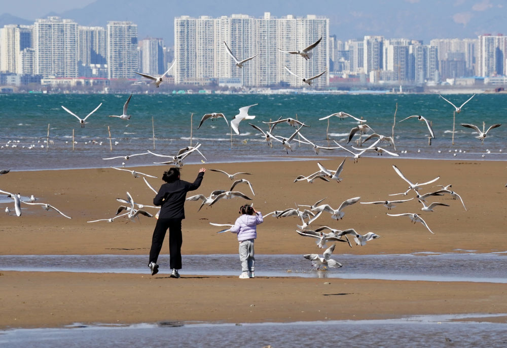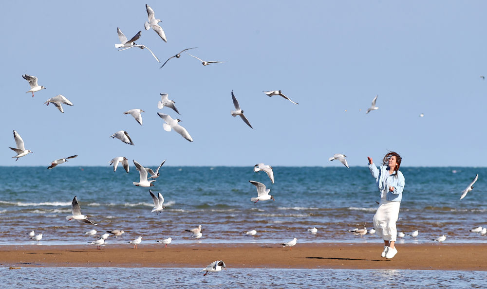 ↑4月7日,游客在河北省秦皇岛市北戴河区沿海地区给海鸥喂食。新华社发(曹建雄 摄)