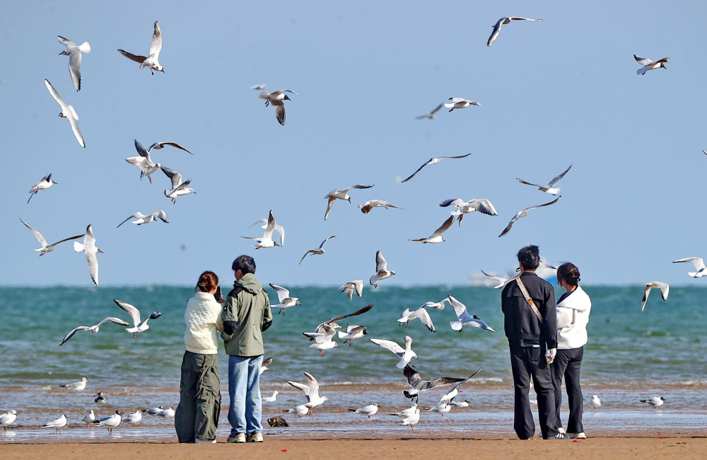 ↑4月7日,游客在河北省秦皇岛市北戴河区沿海地区观看海鸥飞舞。新华社发(曹建雄 摄)