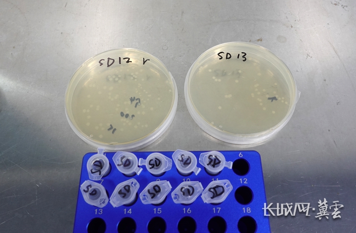 圆形培养皿中的白色斑点,就是“手术成功”的菌株。 长城网•冀云客户端记者 郑建卫 摄