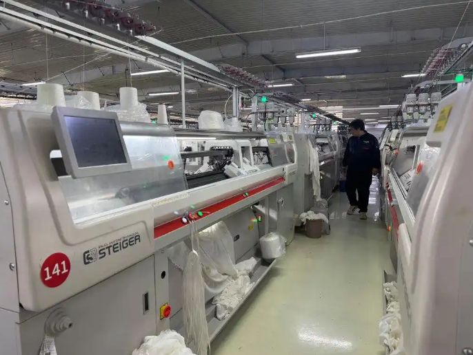 3月12日,清河县兴利智能针织共享工厂生产车间,工人查看数字化一线成型电脑横机运行情况。图片来源:河北日报