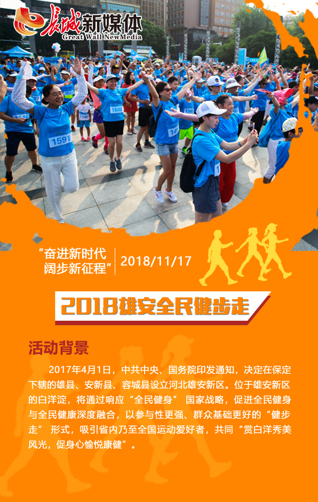 长城网11月16日(记者冯少玲 刘海楠 )11月17日,“奋进新时代 阔步新征程”2018雄安全民健步走活动将在雄安新区白洋淀码头举行。本次活动由河北省体育局、雄安新区管委会主办,据了解,活动吸引6000名健步走爱好者及京津冀户外运动爱好者参与。