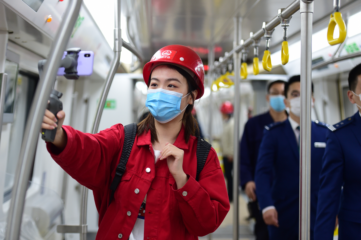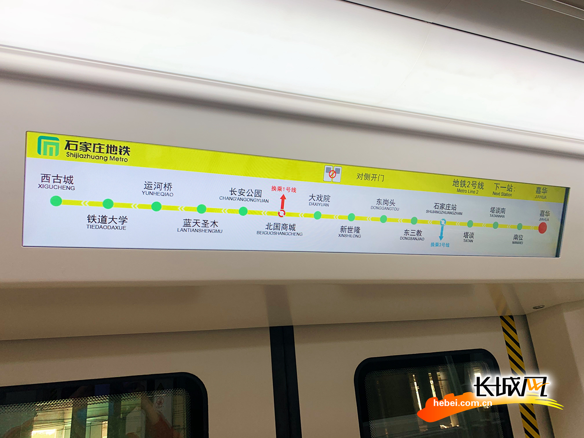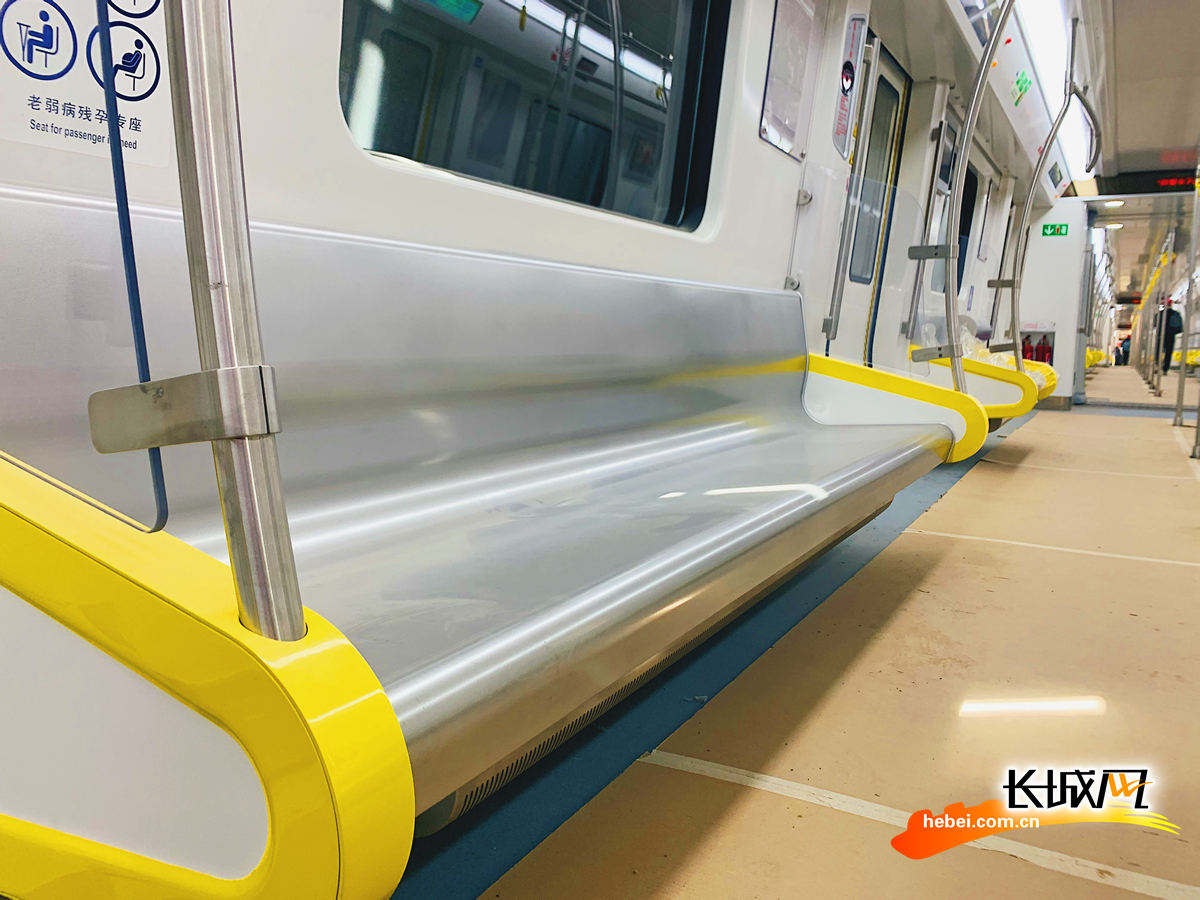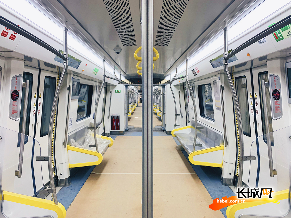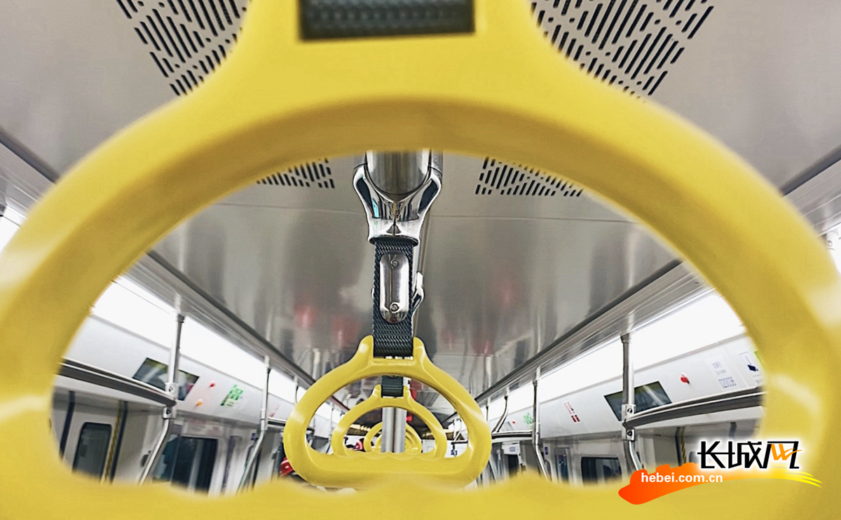 记者直播介绍石家庄地铁2号线车厢内部情况。张晓峰 摄