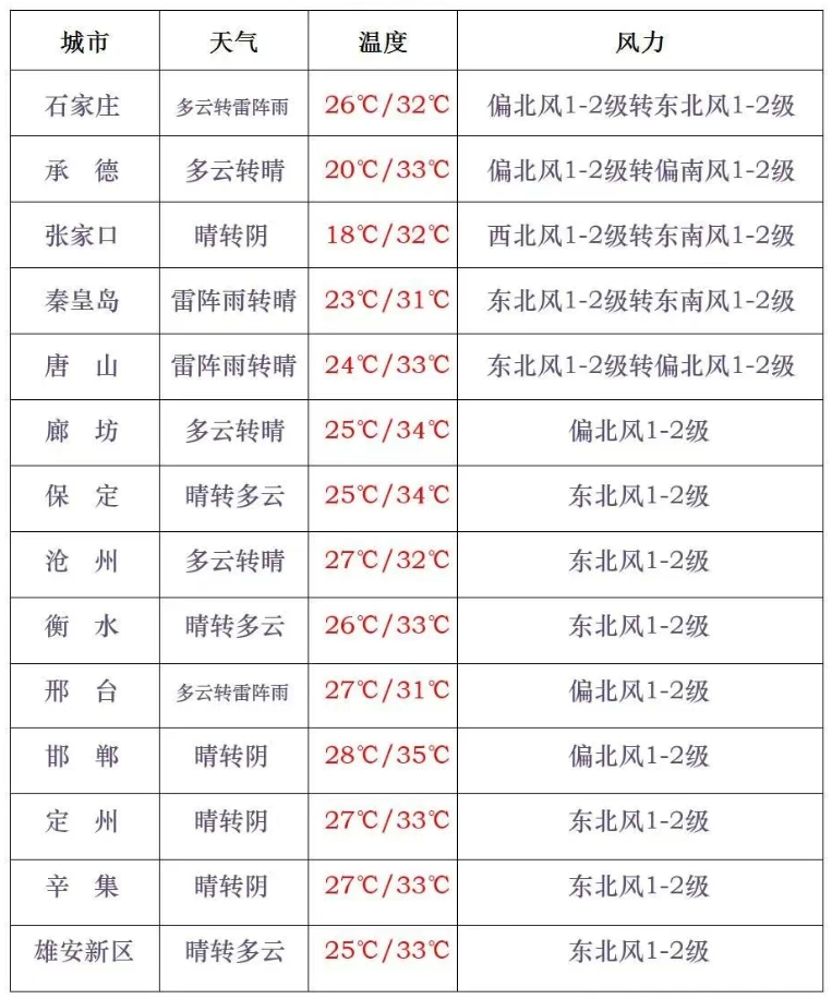 今天白天,张家口南部、保定西部、石家庄西部、邢台西部、邯郸多云转阴有分散性雷阵雨或阵雨,雷雨时局地伴有短时强降水、短时大风等强对流天气,其他地区晴间多云。