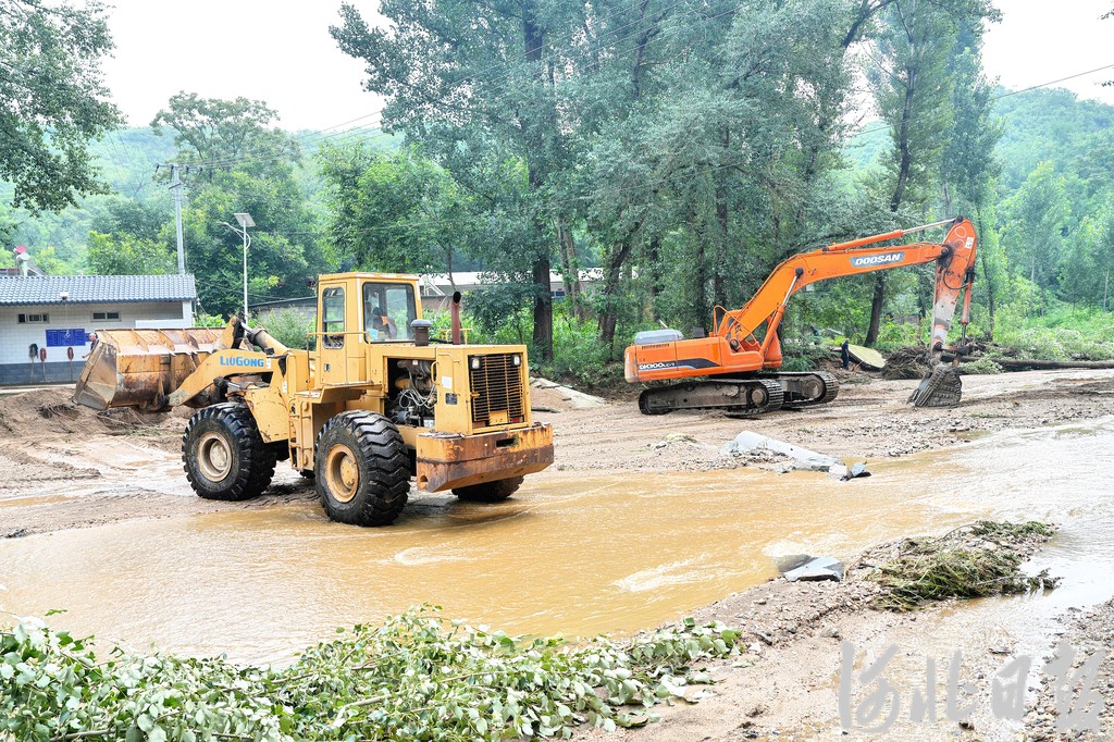 7月28日,阜平县交通运输局组织人员抢修柳树底村水毁道路。河北日报记者 王伟 摄