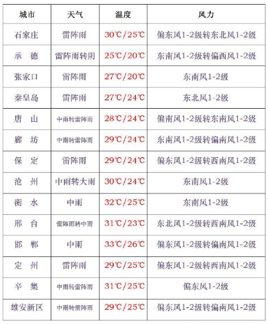 今天白天,全省阴有雷阵雨或阵雨,其中廊坊、保定东部、雄安新区、沧州、石家庄东部、衡水、邢台东北部、邯郸西南部有中到大雨。