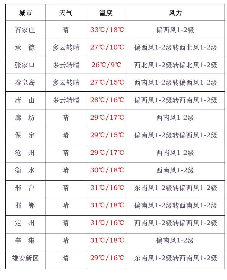 今天白天,保定、廊坊及以北地区多云,其他地区晴间多云。