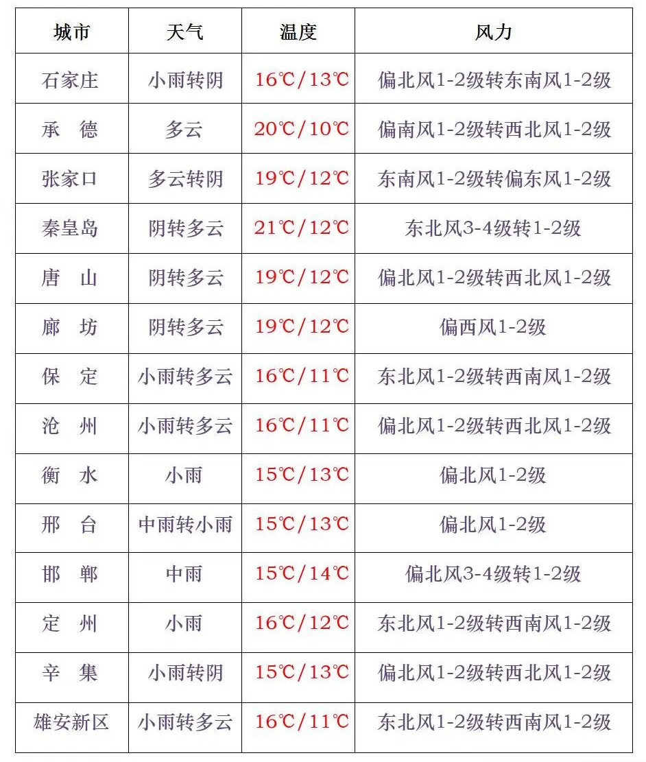 今天白天,张家口南部和保定、廊坊及以南地区阴有小雨,其中石家庄南部、衡水南部、邢台、邯郸有中到大雨;其他地区多云间阴。