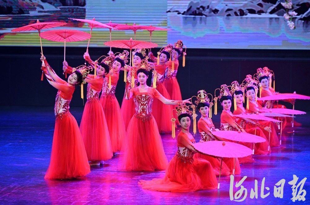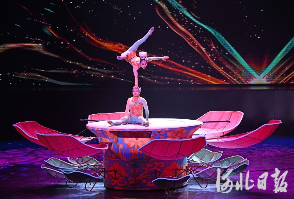 10月6日,第二十届中国吴桥国际杂技艺术节首场国际杂技盛典在河北省艺术中心大剧场启幕。图为《焕舞华蓉——顶碗》节目。河北日报记者张昊摄