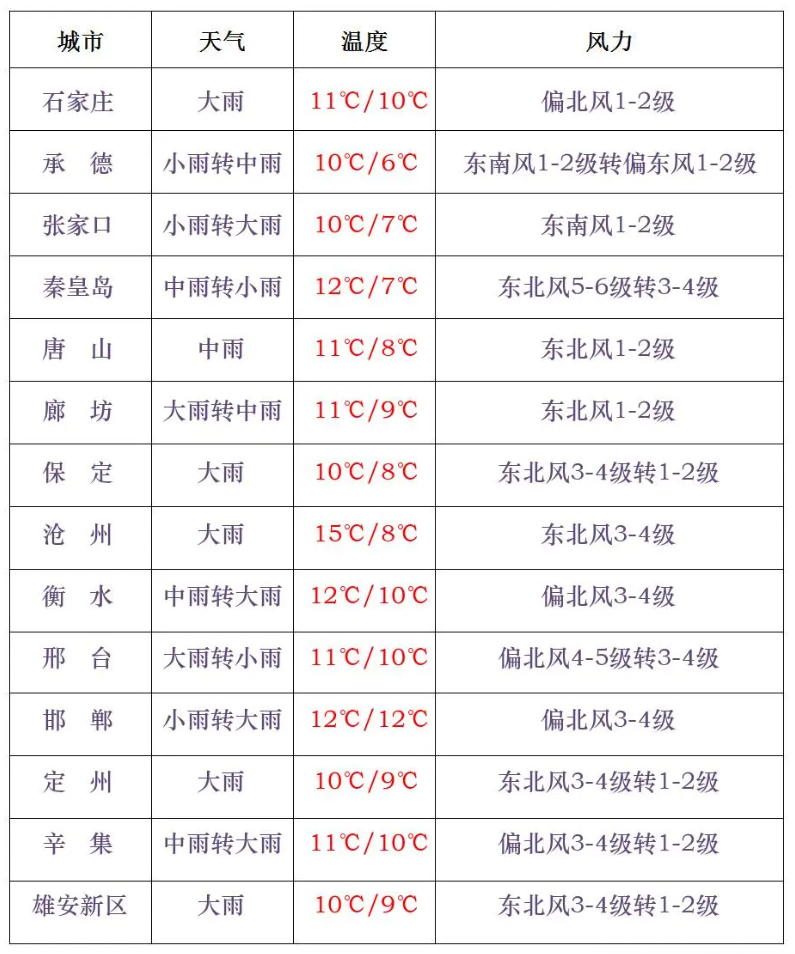 今天白天,全省阴,张家口南部、唐山、秦皇岛南部、保定、雄安新区、廊坊、石家庄、沧州、衡水、邢台北部有中到大雨,坝上地区有小雪或雨夹雪,其他地区有小雨。
