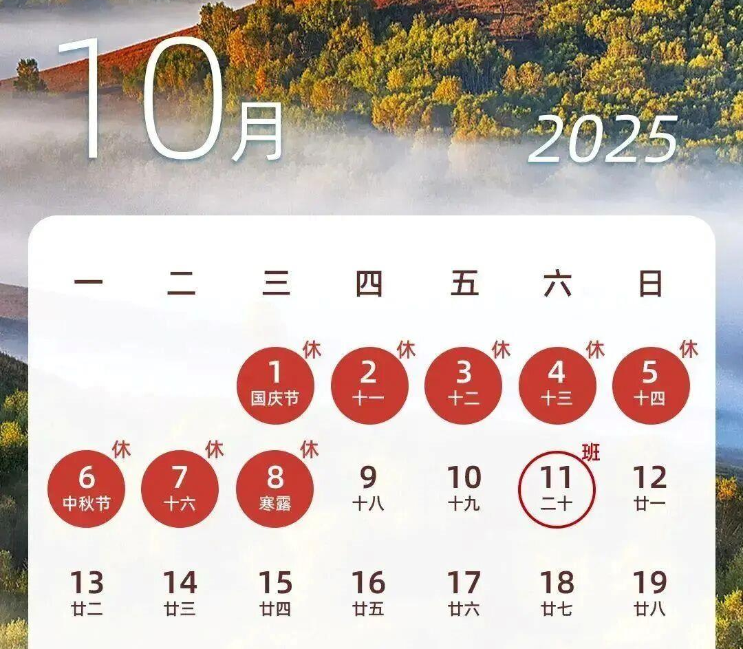 根据国务院办公厅关于2025年部分节假日安排的通知,10月1日(周三)至8日(周三)放假调休共8天,本周六(10月11日)要上班,别忘了定好闹钟。