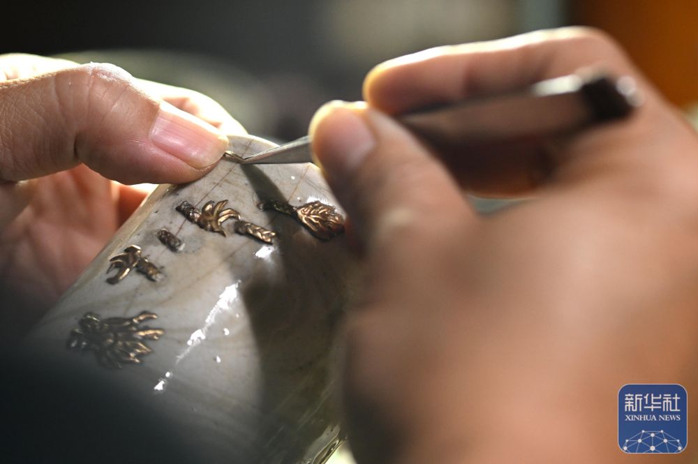 ↑ 10月11日,在位于河北省石家庄市桥西区的工作室内,李军航为残破瓷器嵌钉。新华社发(陈其保摄)