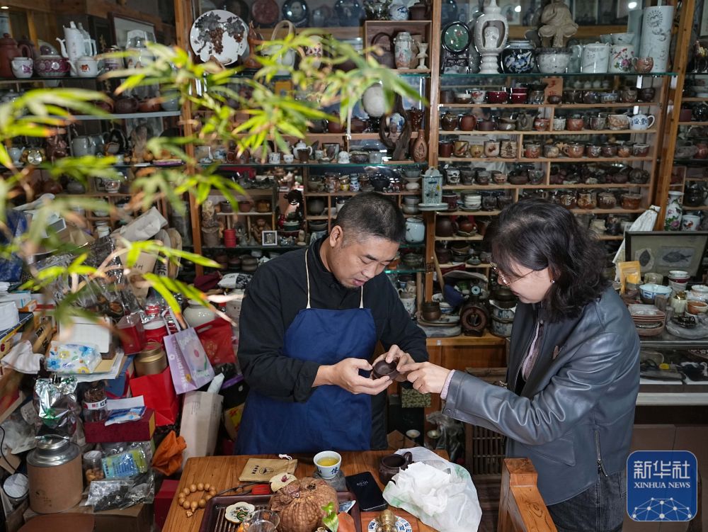 ↑ 10月11日,在位于河北省石家庄市桥西区的工作室内,李军航在接待顾客。新华社发(闫志国摄)