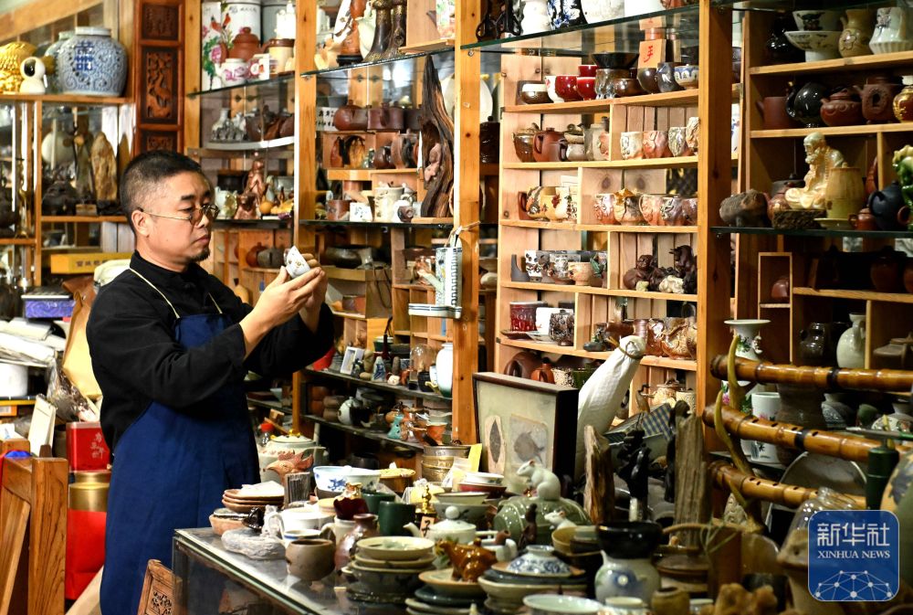 ↑ 10月11日,在位于河北省石家庄市桥西区的工作室内,李军航在检查残破瓷器情况。新华社发(陈其保摄)