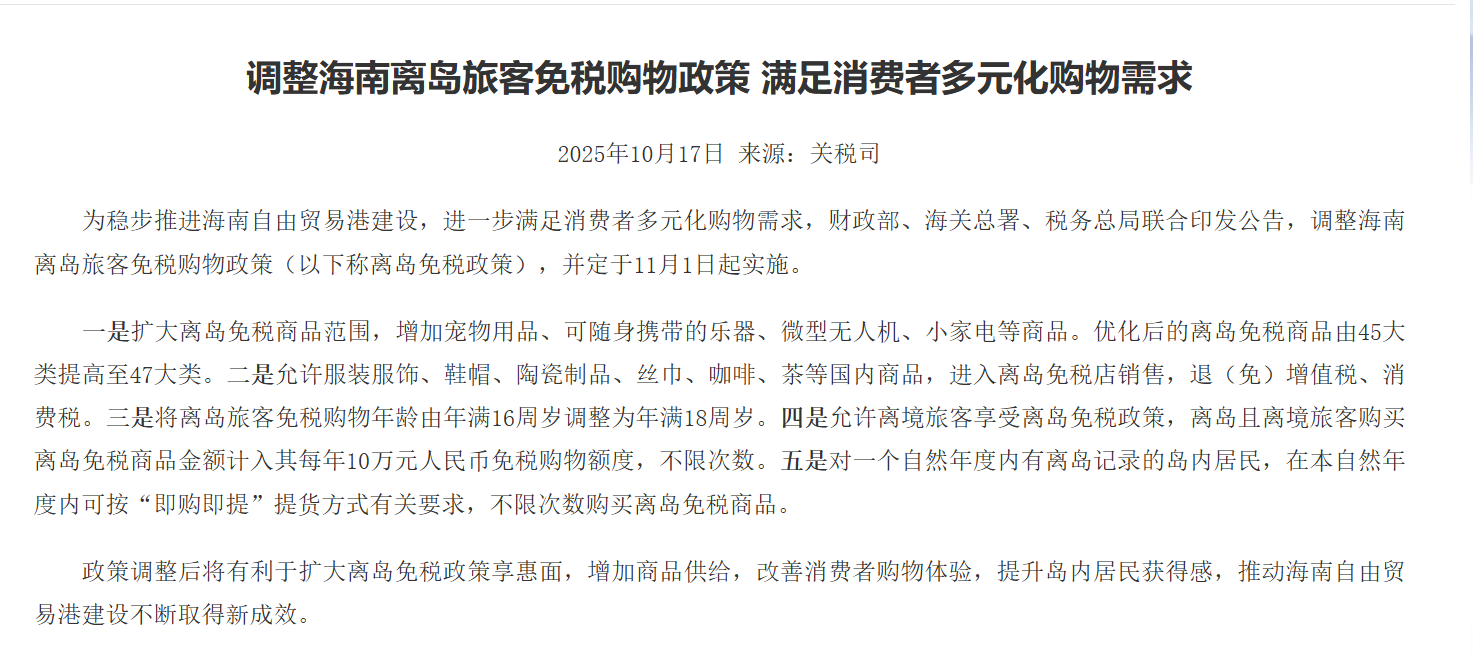 为进一步扩大政策效应,支持海南自由贸易港建设,10月17日,财政部、海关总署、税务总局联合印发公告,调整海南离岛旅客免税购物政策,并定于11月1日起实施。