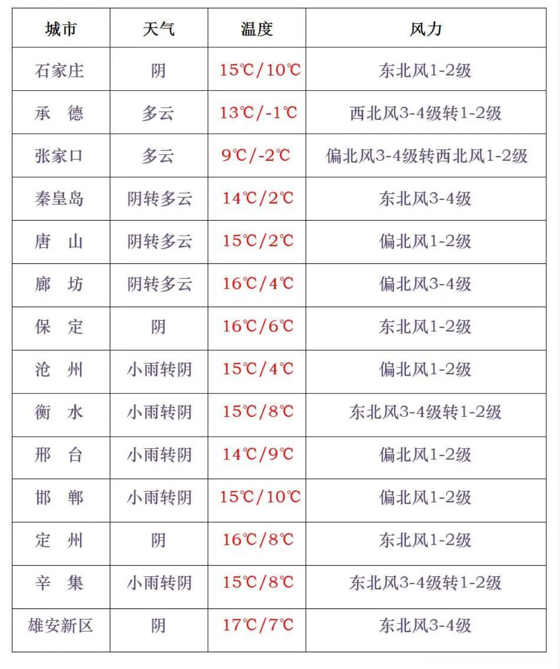 今天白天,张家口、承德西北部、保定西北部、石家庄西北部山区多云转阴有雨夹雪或零星小雨,其中坝上地区有小雪,其他地区晴转多云。