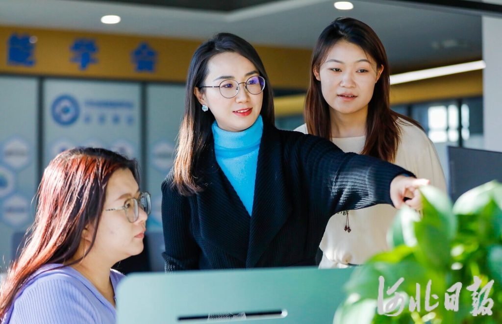近日,孟晓敏(中)与同事在探讨工作项目。河北日报记者耿辉摄