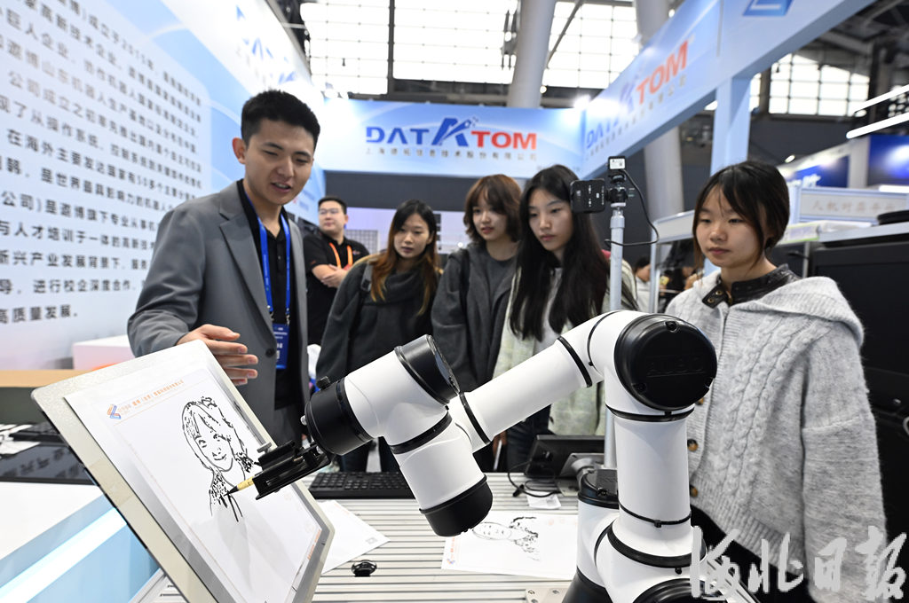 10月17日,观众在参观智能绘画机器人。