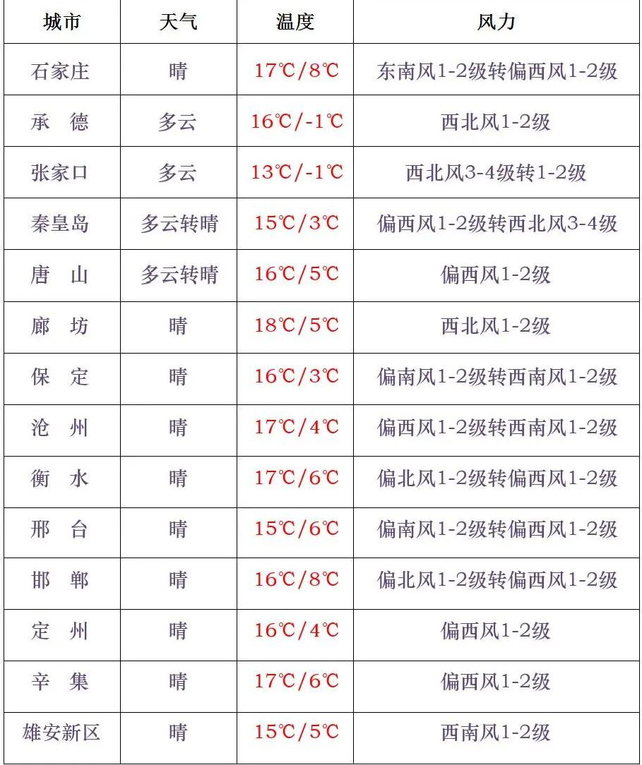 今天白天,张家口北部、承德北部阴有零星小雪或雨夹雪转多云,其他地区多云转晴。