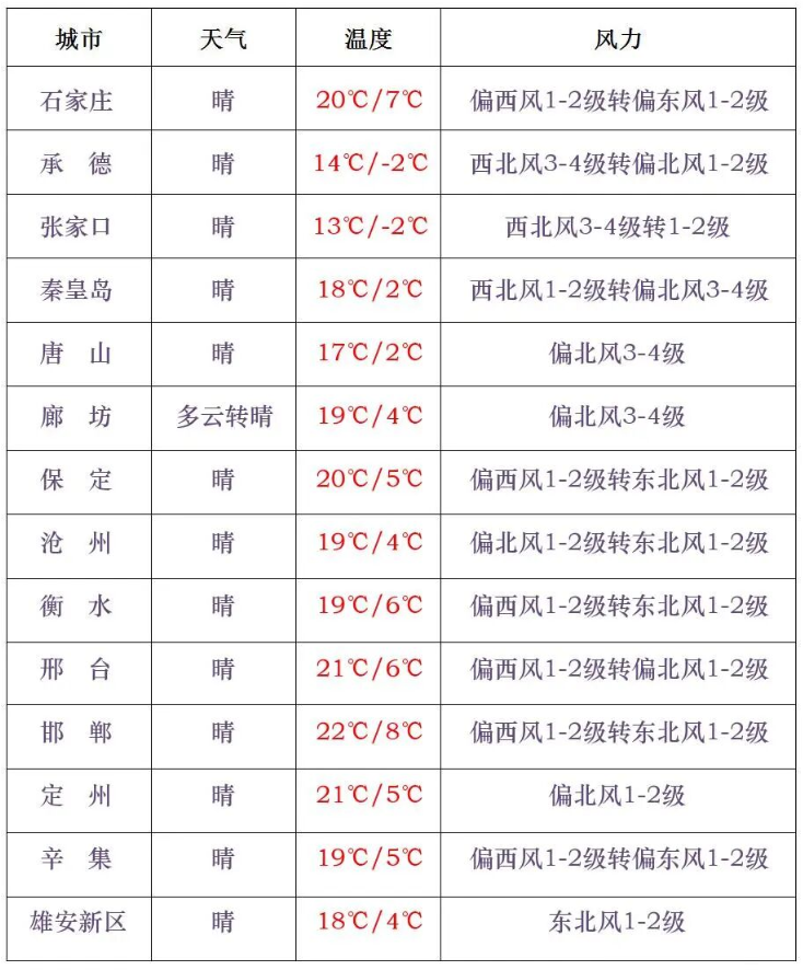 今天白天,张家口北部、承德北部多云转晴,其他地区晴间多云。