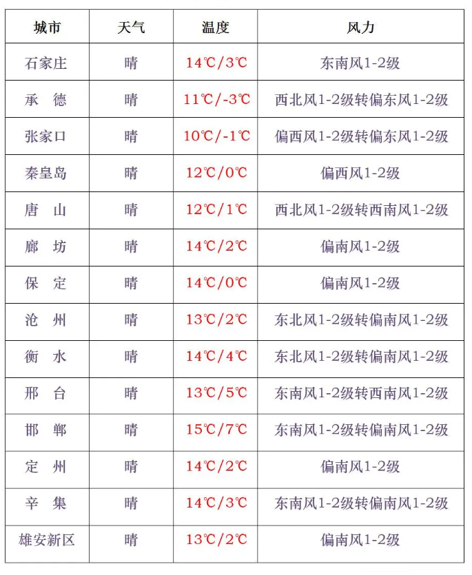 今天白天,全省晴间多云。早晨,石家庄、衡水及以北地区最低气温下降3~6℃。