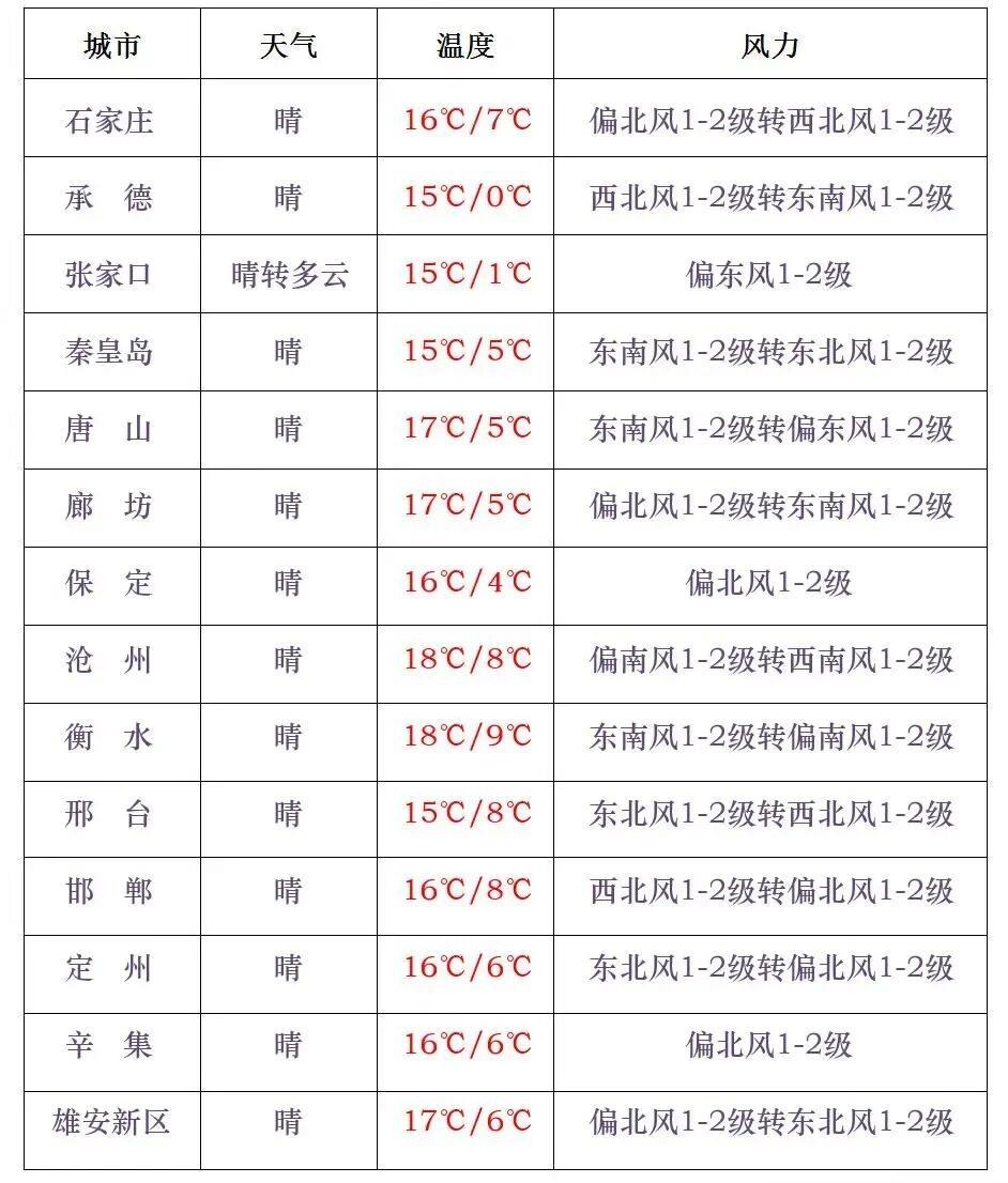 今天白天,全省晴间多云。今天夜间到明天,张家口北部、承德北部、保定西北部多云转阴有小雨或零星小雨,其他地区晴间多云。
