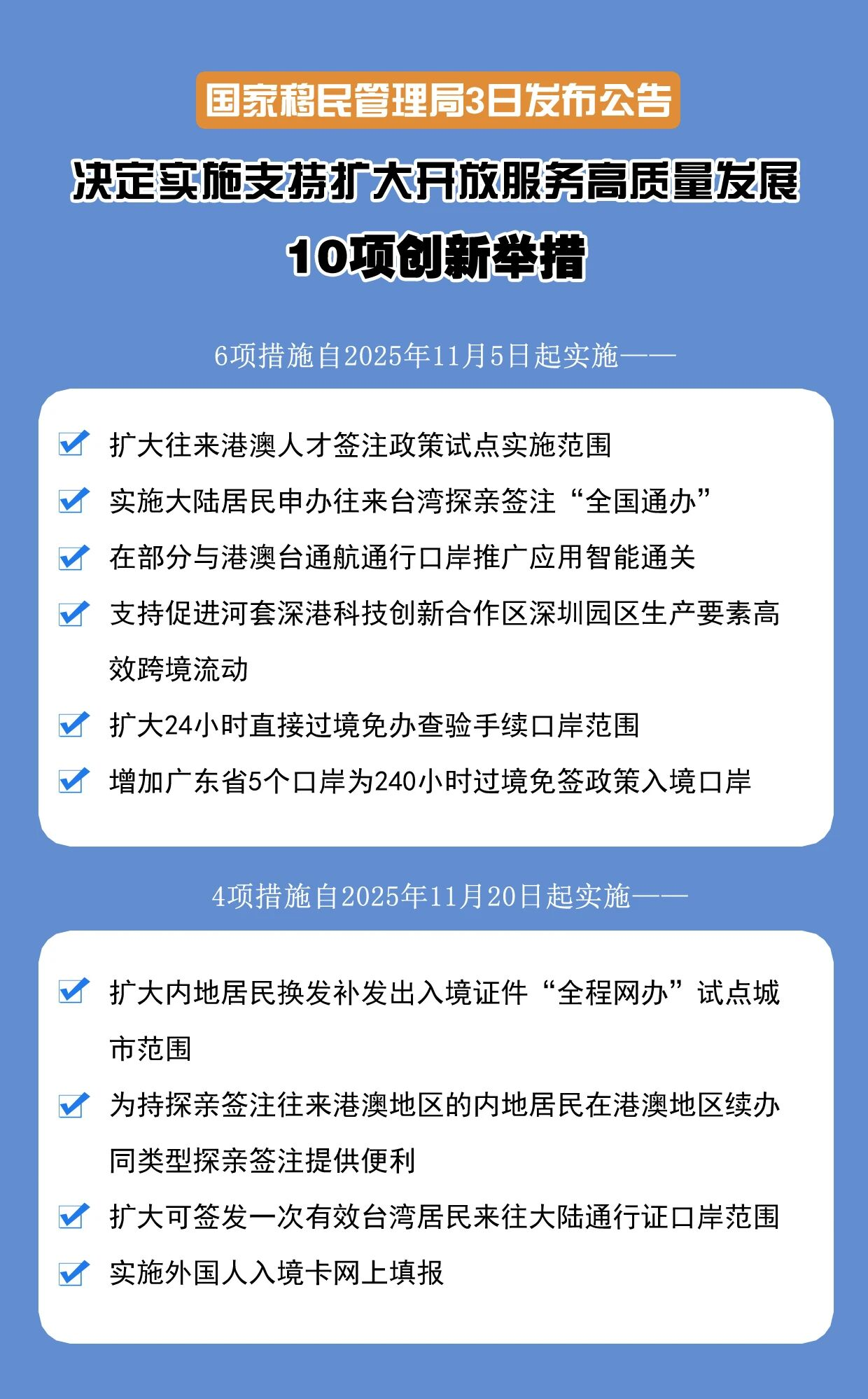 国家移民管理局3日发布公告,决定实施支持扩大开放服务高质量发展10项创新举措,6项措施自2025年11月5日起实施,4项措施自2025年11月20日起实施。