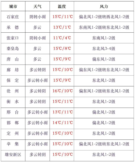 今天白天,张家口和保定、石家庄、邢台、邯郸四个地区的西部多云转阴有小雨或零星小雨,其他地区多云。