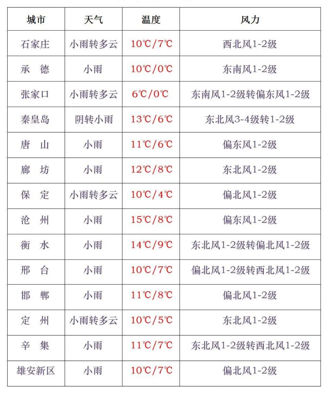 今天白天,全省阴,坝上地区阴有雨夹雪或小雪,张家口南部、保定北部局地有中雨,其他地区有小雨或零星小雨。