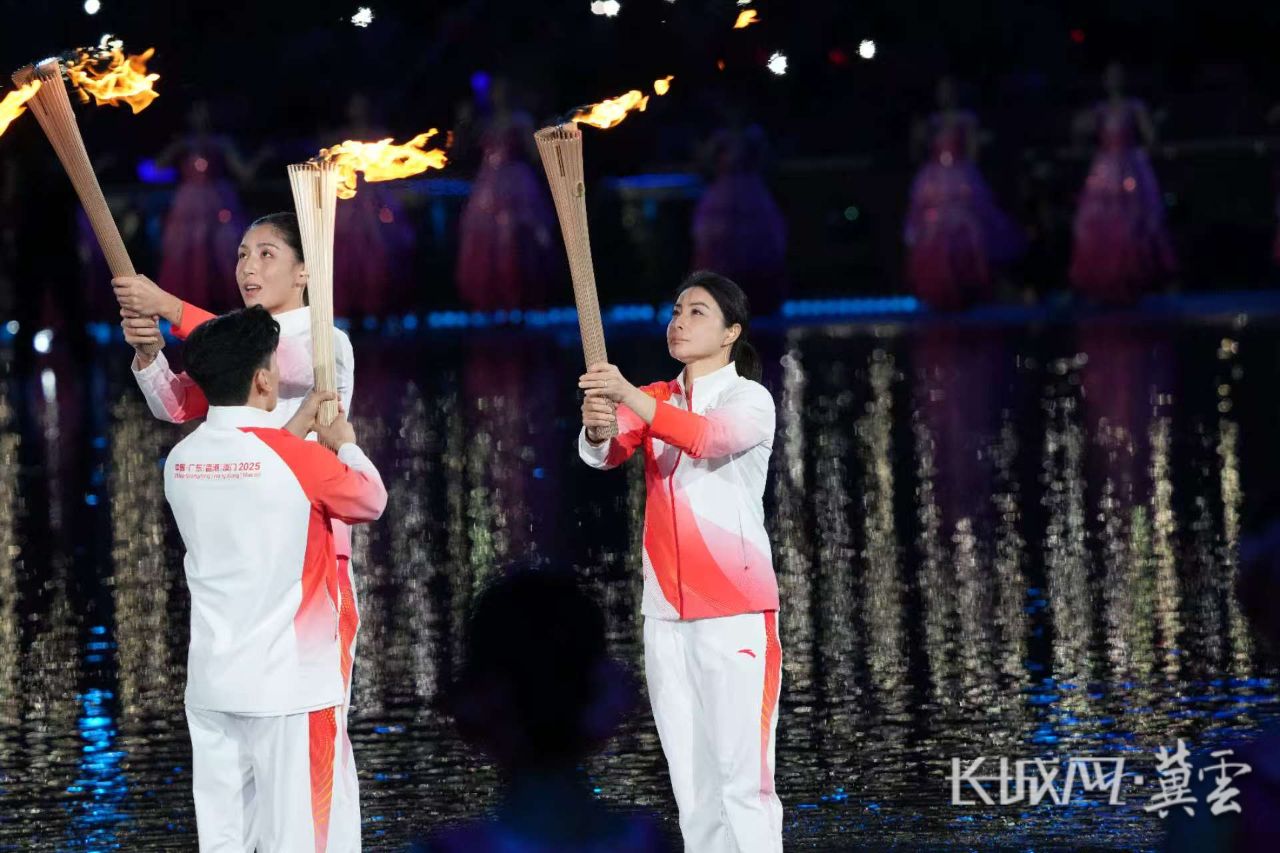 郭晶晶(右一)在第十五届全运会开幕式上传递火炬。长城网·冀云客户端记者 韩颜 摄