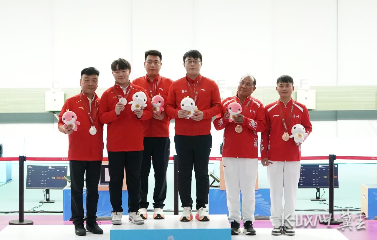牛琪松(左四)为河北代表团夺得本届全运会首金。长城网·冀云客户端记者 韩颜 摄