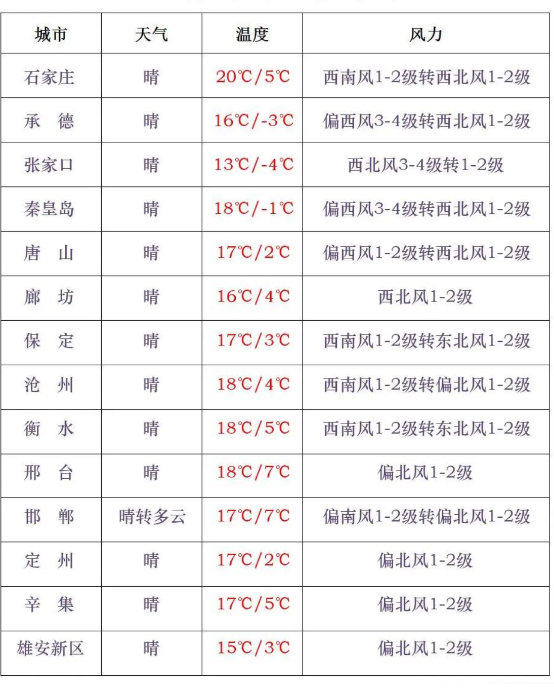 今天白天,全省晴间多云。张家口、承德西部、保定西北部有西北风4到6级,阵风7到8级,局地可达9级。