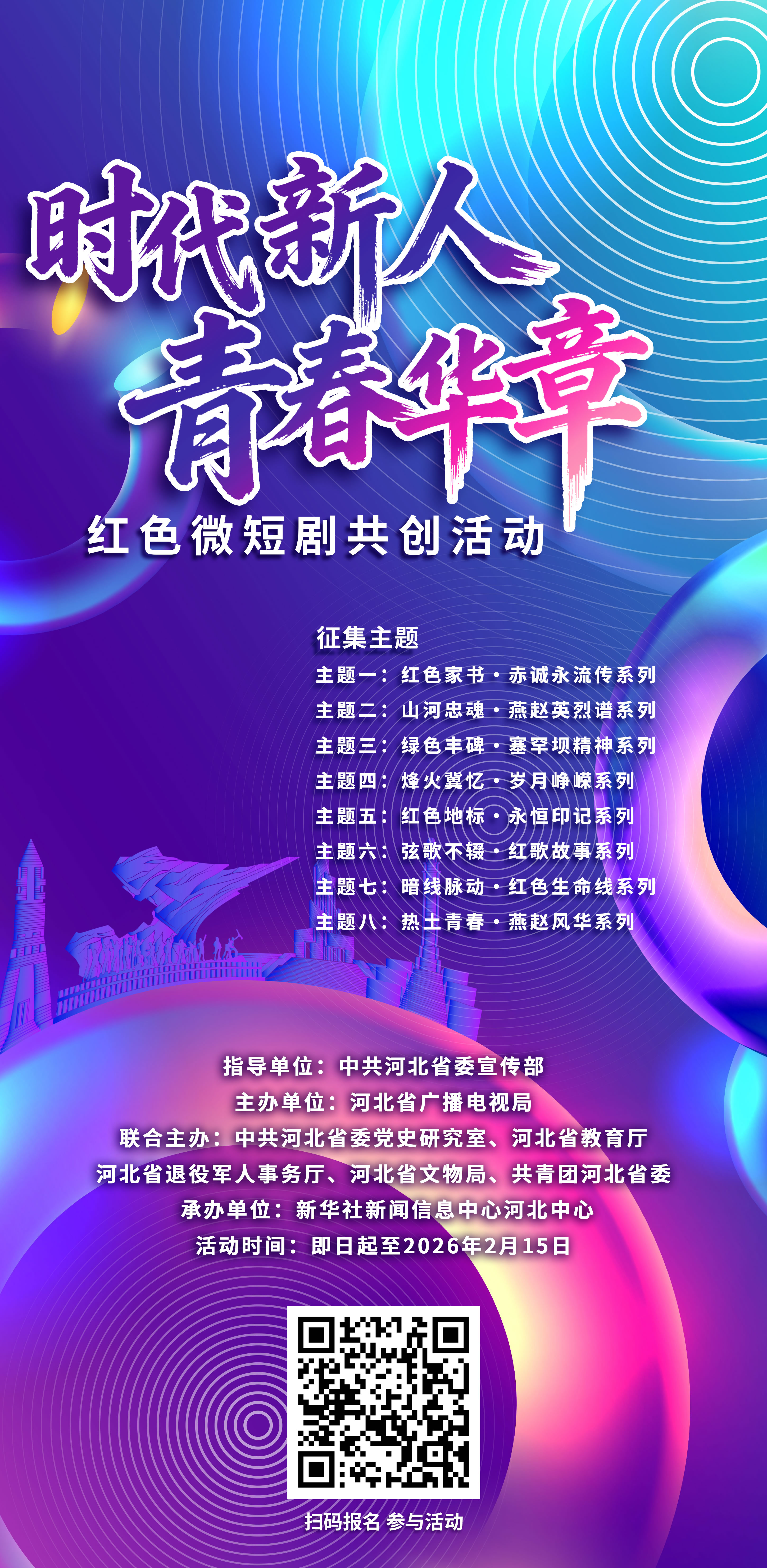 本次征集活动聚焦八个主题,分别为红色家书·赤诚永流传系列、山河忠魂·燕赵英烈谱系列、绿色丰碑·塞罕坝精神系列、烽火冀忆·岁月峥嵘系列、红色地标·永恒印记系列、弦歌不辍·红歌故事系列、暗线脉动·红色生命线系列、热土青春·燕赵风华系列。据悉,征集活动截止时间为2026年2月15日,最终将评审出30部优秀剧本和10部优秀作品。(刘莉娜 杨曼青)