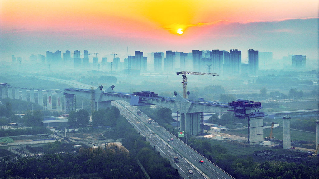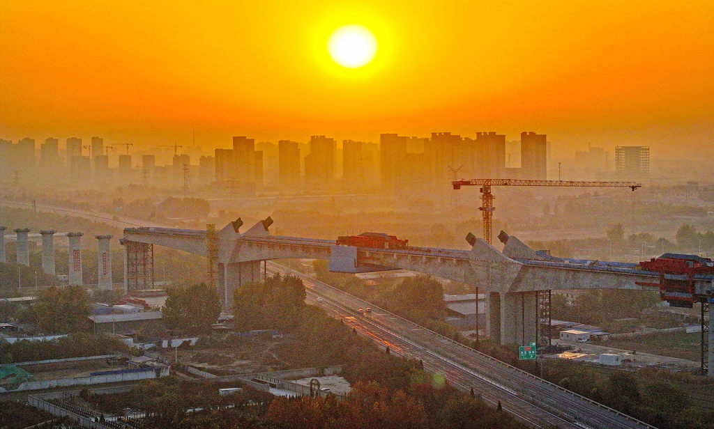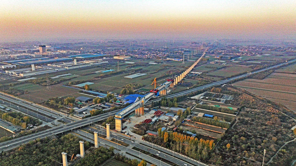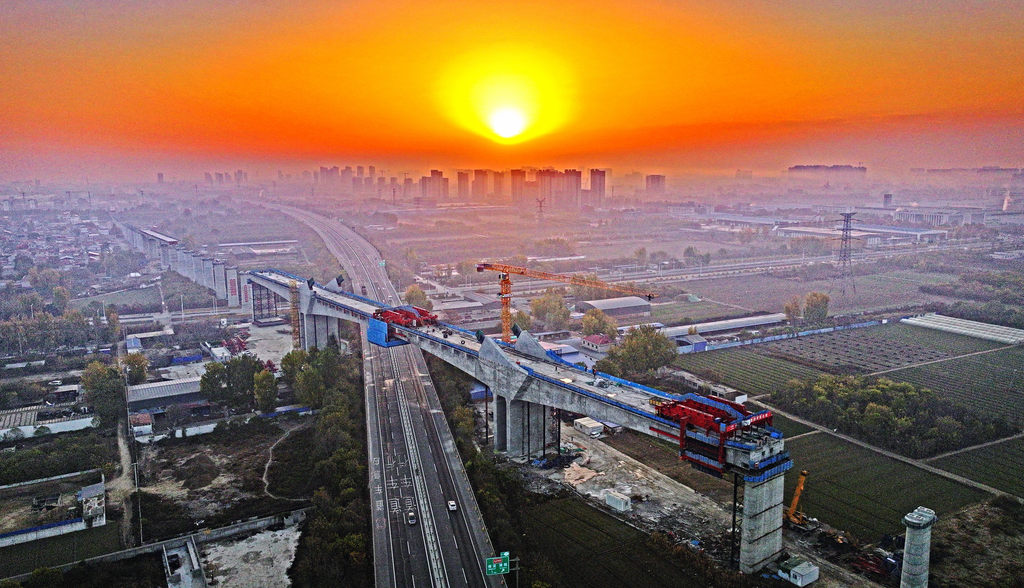 11月15日,朝阳下的雄忻高铁跨保沧高速特大桥系杆拱桥。