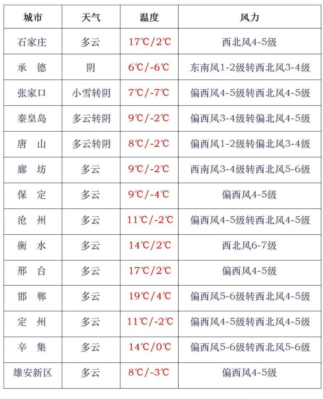 今天白天,张家口、承德北部多云转阴有小雪或零星小雪,其他地区晴转多云。